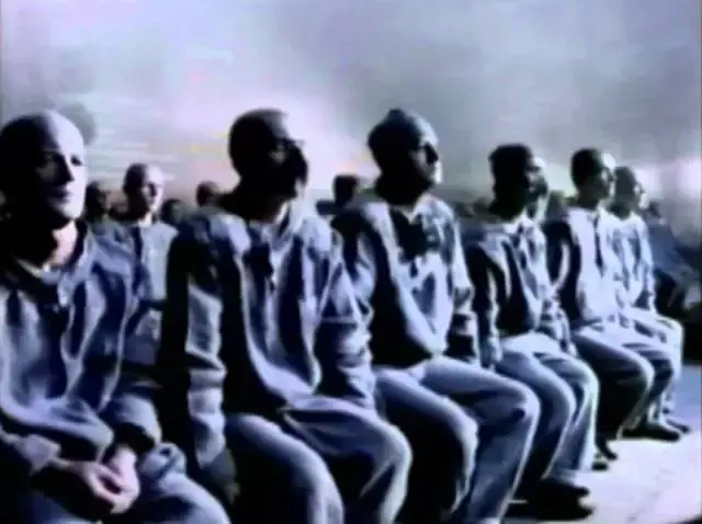 一群目光呆滞,被精神控制的人坐在大屏幕前,