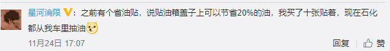 贴油箱盖子上可以节省 20% 的油,我买了十张贴着,现在中石化都从我车里抽油。