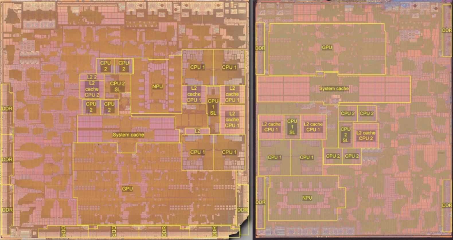 从半导体公司Techlnsights公布的两款芯片分析图可以看出,M1芯片拥有4个性能核心和4个能效核心,CPU总共加起来有8个核心。相较之下,A14仿生少了两个核心,CPU总核心数为6个,包括两个性能核心和4个能效核心。