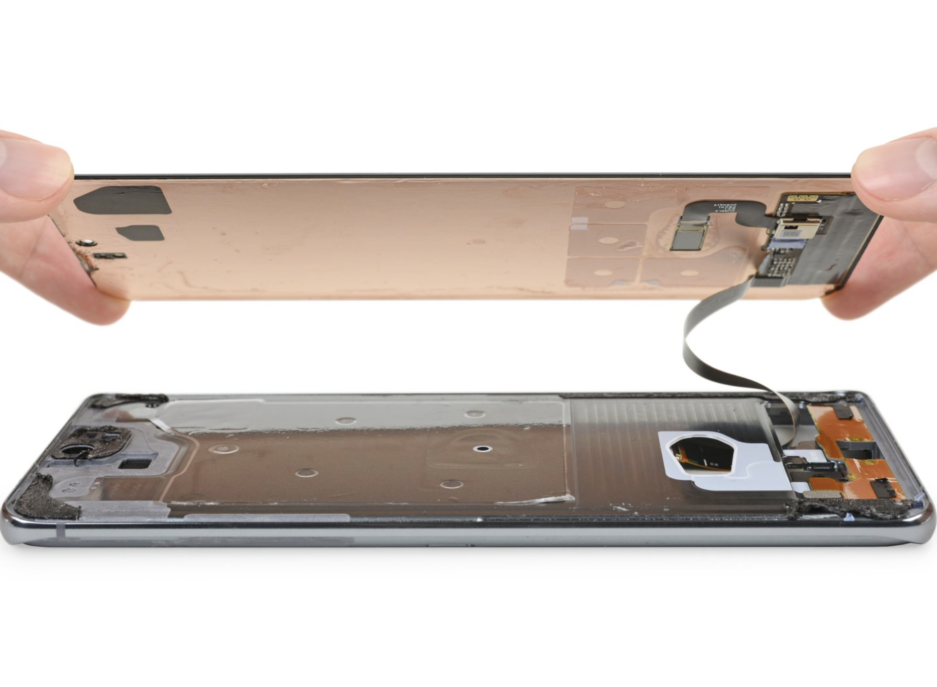 而安卓这边,以三星Galaxy S20 UItra为例,可以看到,散热铜箔几乎覆盖了整个盖板,主板部分也覆盖了一层石墨烯散热膜,以此来确保手机的性能释放可以达到最佳状态。
