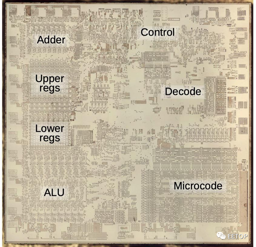 对于下面的管芯照片,去除了金属和多晶硅层,显示了具有29,000个晶体管的底层硅。2 标签是根据我的逆向工程显示的主要功能块。芯片的左侧包含16位数据路径:芯片的寄存器和算术电路。加法器和高位寄存器构成与外部存储器通信的总线接口单元,而低位寄存器和ALU构成处理数据的执行单元。芯片的右侧具有控制电路和指令解码,以及控制每个指令的微码ROM。