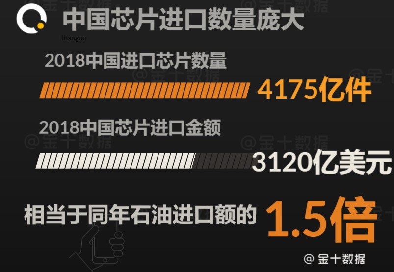 在中国芯片行业,曾流传过这么一句话:除了水和空气,其他全从国外进口的 。数据显示,2018年中国进口芯片数量为4175.7亿件,同比增长10.8%,进口金额达到3120.58亿美元,同比增长19.8%,这是中国芯片进口额首次突破3000亿美元,是同年原油进口额的1.3倍,同时也是中国芯片进口连续十年超过原油 。