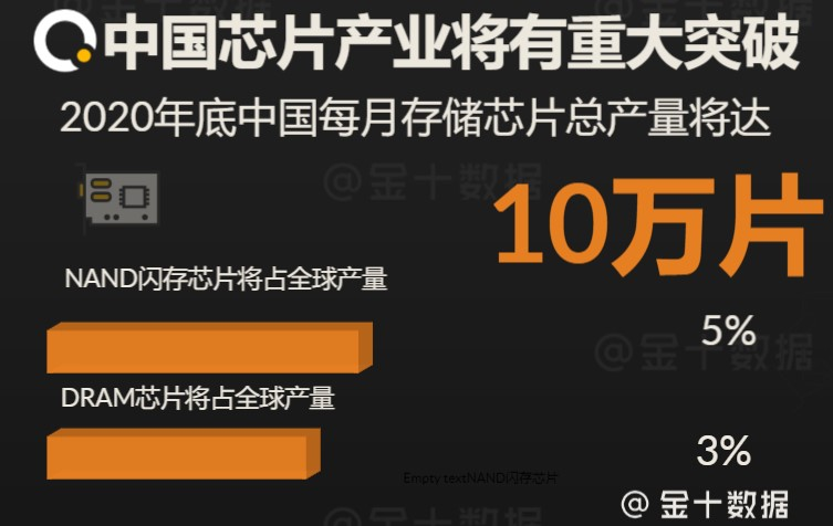 据了解,今年9月中国半导体企业紫光集团旗下的长江存储已经开始对自主研发的64层3D NAND闪存芯片进行量产。而据其预计,到明年年底,其投资240亿美元新建的武汉工厂的产量将增加两倍,达到每月6万片,占全球产量的5% 。与此同时,长鑫存储在合肥投资80亿美元所建工厂的DRAM芯片产量将增加三倍,达到每月4万片,占世界DRAM产量的3%。