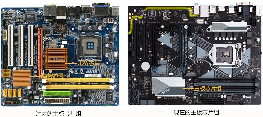 过去的主板芯片组是分北桥芯片和南桥芯片的 ,北桥负责对不同CPU类型和主频的支持、内存控制、PCI-E总线通信,南桥负责各种I/O(输入输出)通信。像过去的Intel平台的G31、G41,AMD平台的780L、760G等,都采用的南北桥设计。