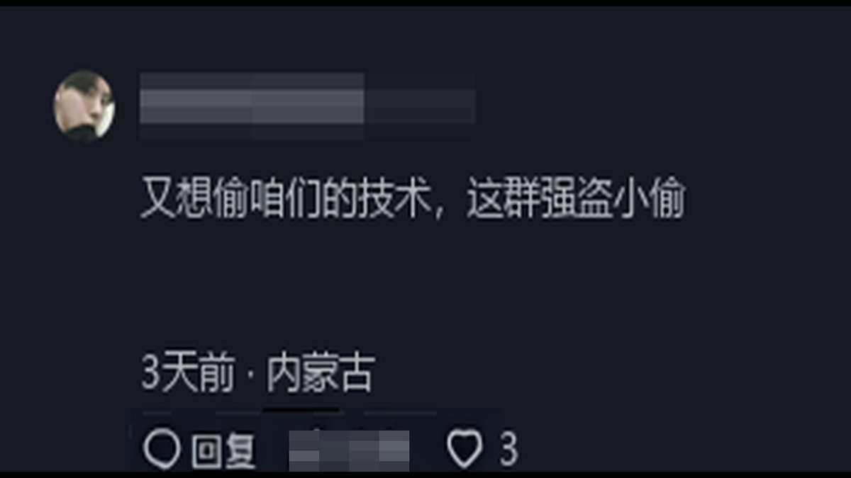 又想偷咱们的技术,这群强盗小偷。这句评论情绪最为激烈,将美国描绘成了技术窃贼,表达了网友对技术窃取行为的强烈不满与愤慨。
