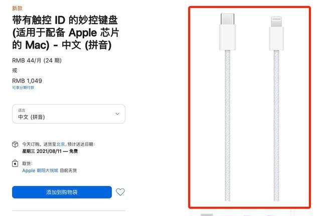 值得注意的是,这一次带有Touch ID的妙控键盘包装内,还附带一根新型编织材质的USB-C转闪电连接线,可连接至Mac上的USB-C端口,进行配对和充电。另外在续航方面,苹果称其内置电池拥有极为持久的续航能力,每充满一次电,可使用大约一个月或更长时间。