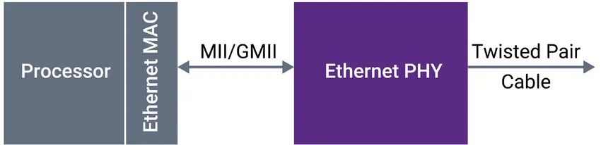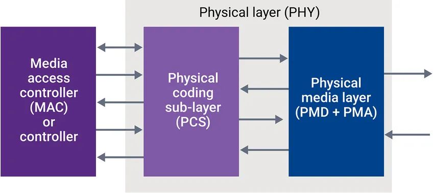 以太网物理层(简称PHY)是一个抽象层,负责传输和接收数据。PHY对传输的数据帧进行编码,并按照特定的操作调制速度、传输媒体类型和支持的链路长度对接收的帧进行解码。举个例子,我们的笔记本电脑都有“以太网接口”。图1描述了如何通过以太网电缆将数据传入和传出处理器。在这种情况下,由CPU中的以太网MAC组装的以太网数据帧(数据包),通过IEEE802.3标准定义的MII/GMII穿过母板(一个印刷电路板),到达以太网PHY。超大规模数据中心的以太网PHY