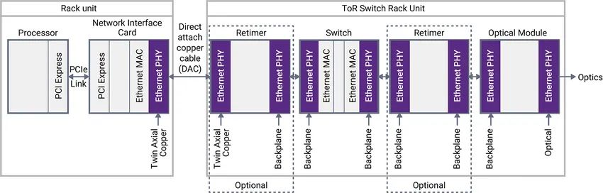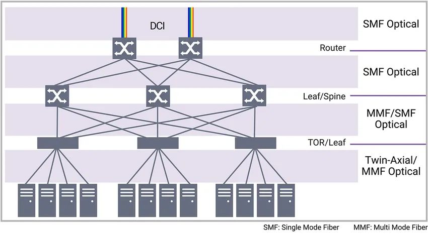 数据中心实际上是一种通过光和铜介质连接的计算和存储系统的网络。使用到的光纤有单模和多模两种,单模光纤 (SMF) 更加节能,同时可提供最大的覆盖范围,而多模光纤 (MMF) 更具成本效益,通常适用于 500 米以内的使用场景。服务器机架单元到机架顶部 (TOR) 交换机链路通常使用双轴铜缆实现。集成式电气以太网PHY的优势