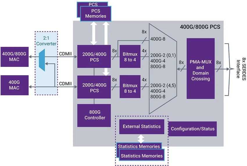 然后,PMA层将PCS格式的信号的逻辑或物理通道数量调整适当,从接收到的信号中恢复时钟,并为本地环回操作提供各种发送和接收测试模式。再往下层,物理介质相关 (PMD) 层接口到传输介质,将PHY连接到介质,介质可以是许多不同类型的光纤或铜缆。最后,自动协商层(AN)使设备能够监测远端设备的功能和状态。IEEE Std 802.3 标准第 73 条定义了新的通用自动协商协议,该协议使用独立于标准速度模式的信号。自动协商允许设备通告和共享信息,包括速度、模式、故障信号和其他控制信息。而集成的以太网PHY IP包括PCS、PMA、PMD和自动协商功能,能够更快地采用最新的 800Gb/s和400Gb/s 以太网。图5显示了800G/400G PCS的实现案例。总结
