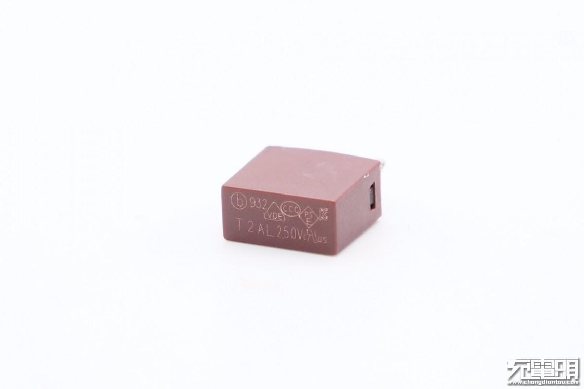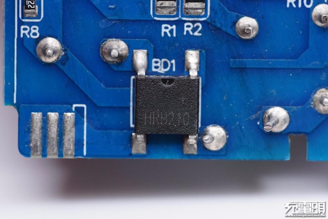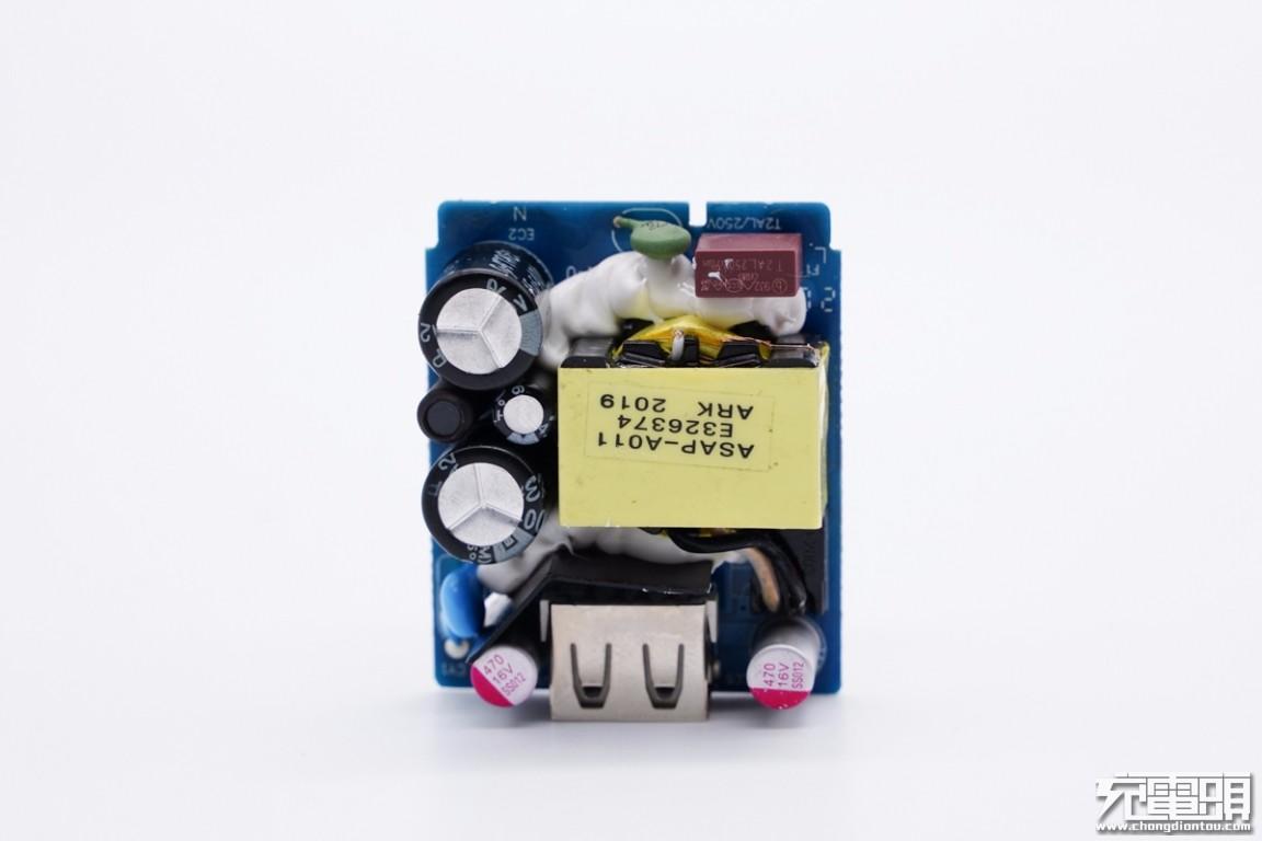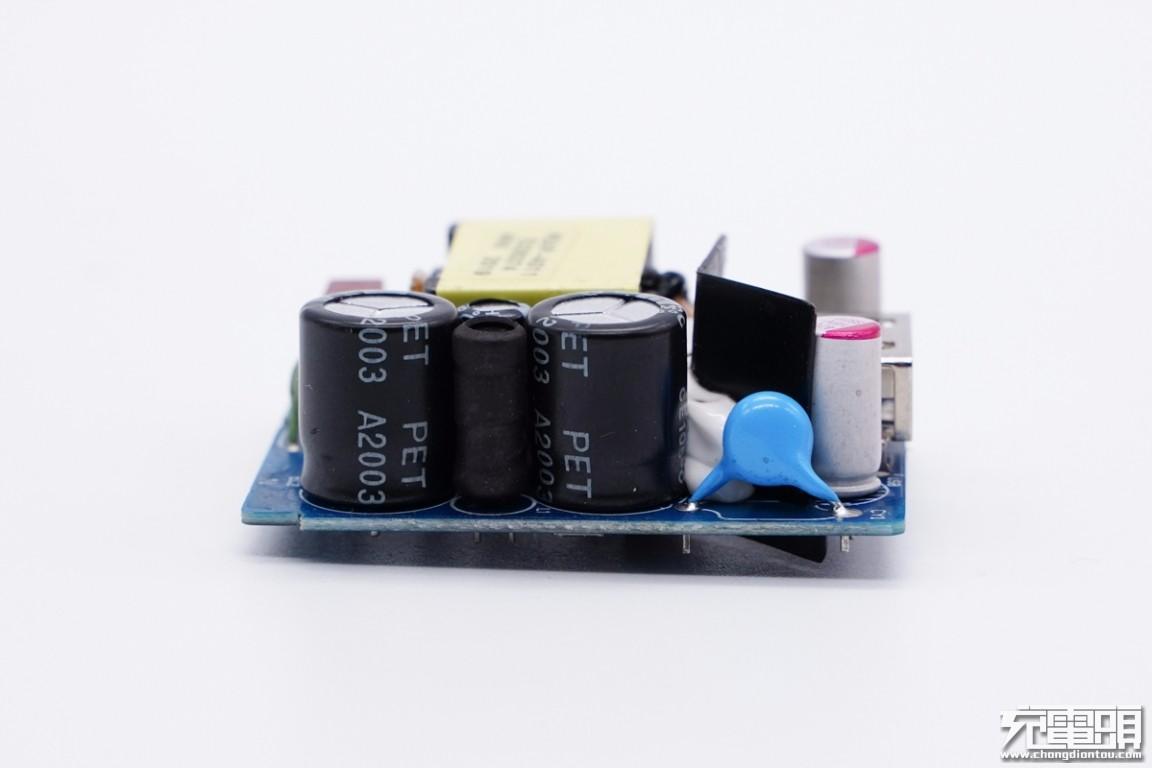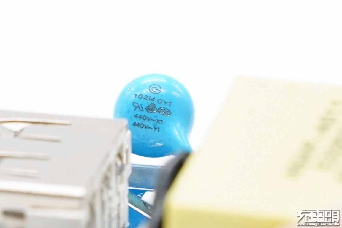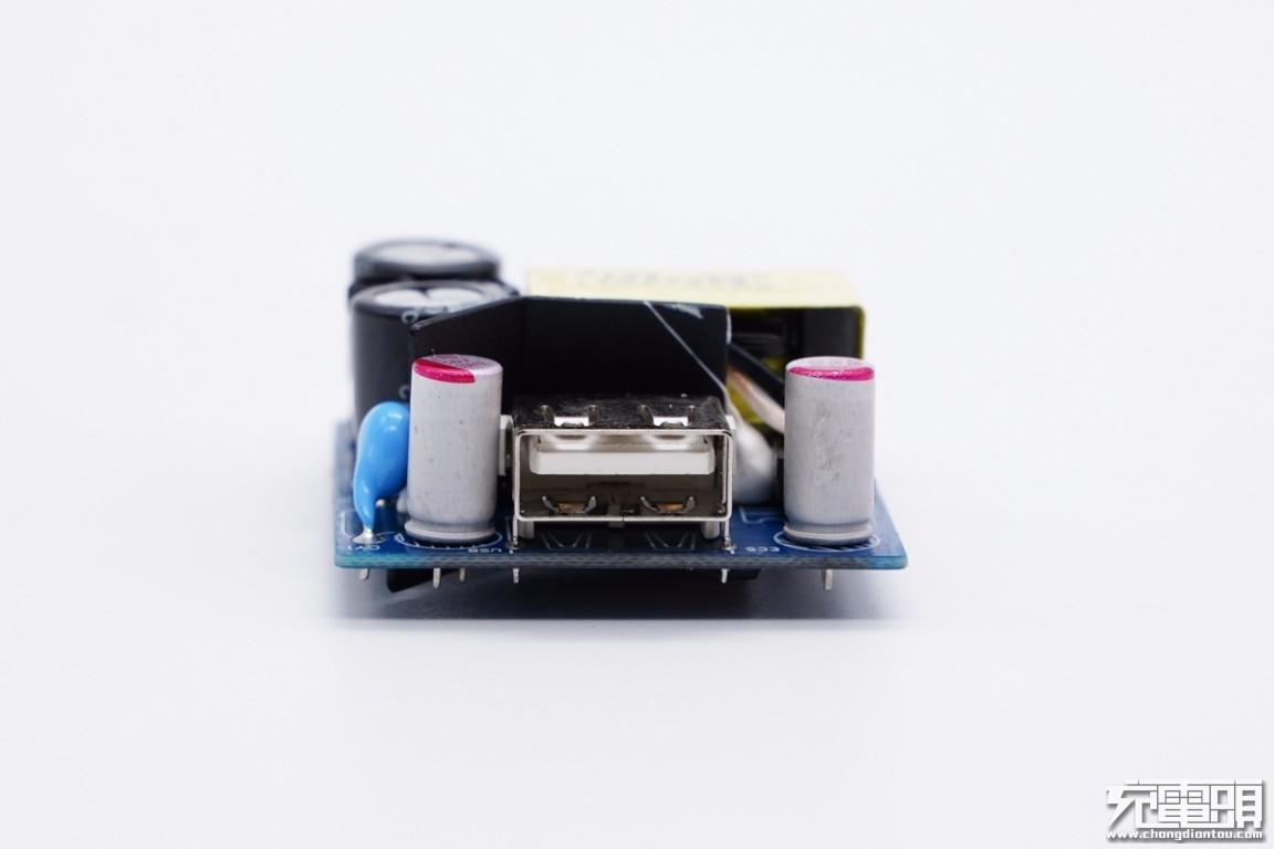 输出端元件一览,USB-A母座两侧有两颗固态电容。