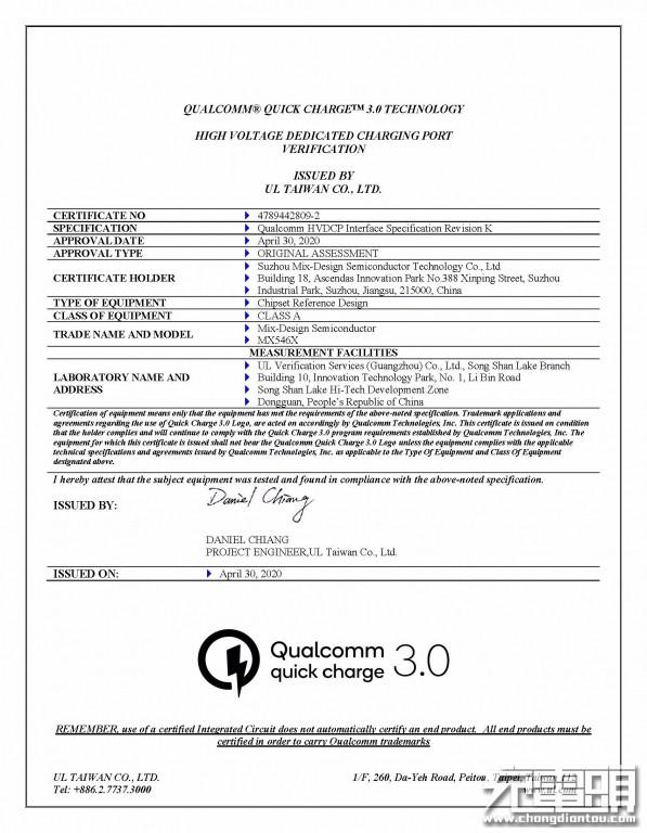 美思迪赛MX5461在2020年4月30日正式获得高通颁发的QC3.0认证证书,编号:4789442829-2,芯片的性能获得高通官方认可。同时,使用认证芯片开发的产品,在兼容性方面也有足够的保证。