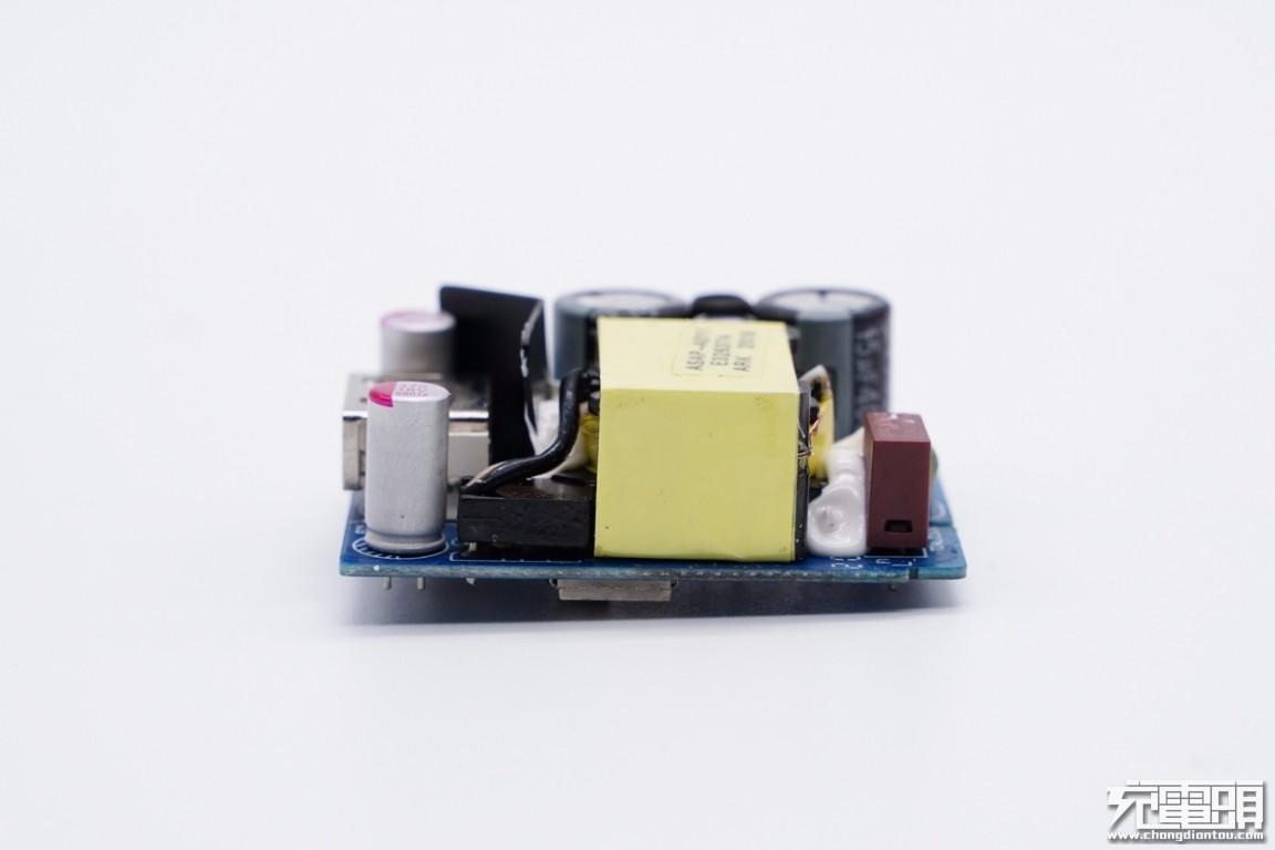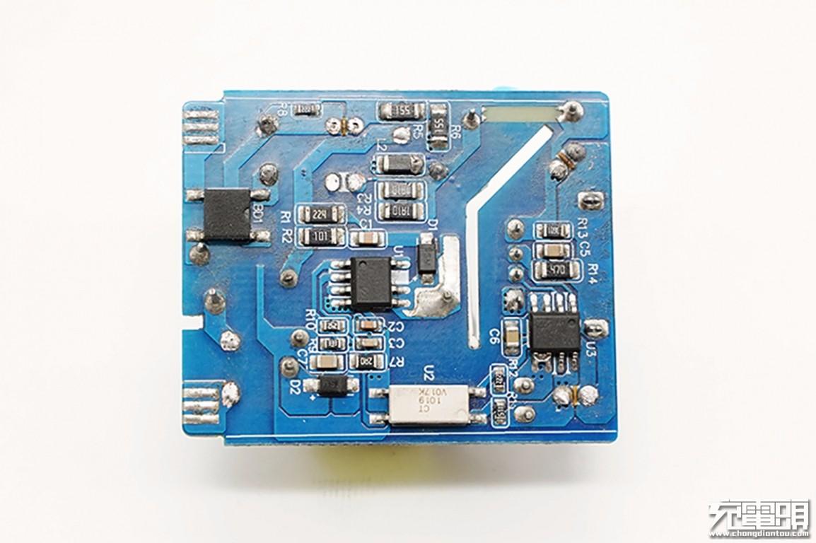 观察PCB贴片面,我们疑惑了,这是个18W的快充吗?除多一个光耦外,整体电路跟一个传统的10W(5V/2A)充电器没有区别,PCB板上的元器件布局十分简洁,初级侧仅用了一颗SOP-7的PWM主控芯片,次级侧也仅有一颗芯片SOP-8的芯片,整个18W的初次级主芯片包含的初级控制器,次级快充协议,同步整流以及初次级功率器件通通包含在2颗SOP-8/7的芯片里面,PCB上除了2个芯片和周边必要的贴片阻容器件,别无他物了。2颗芯片均来自美思迪赛半导体,简单到完全颠覆了快充充电器的电路定义。但是这才是未来快充逐步替代传统10W 充电头的解决方案应该有的样子,美思迪赛半导体做到了。