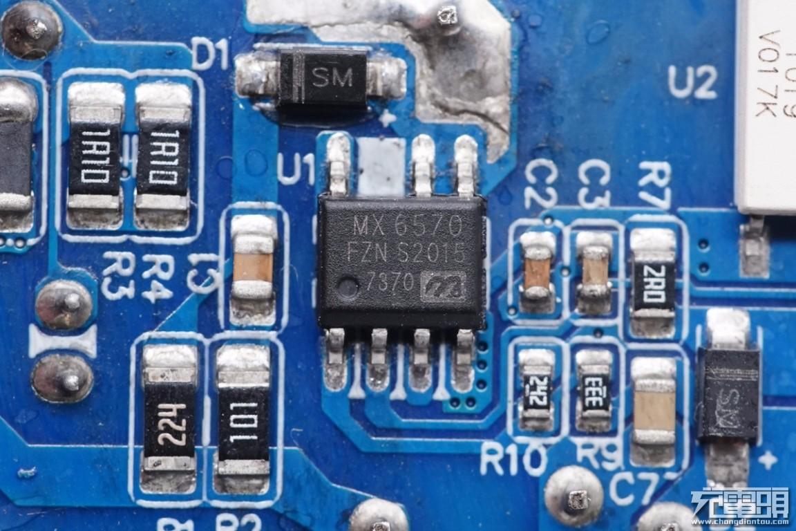 充电器的初级PWM主控芯片采用的是美思迪赛MX6570,这是一颗高性能快充开关电源控制器,内部集成开关管,具备低EMI、低待机功耗等特点,并且支持多种完善的保护功能。