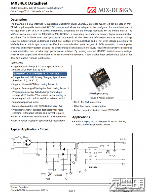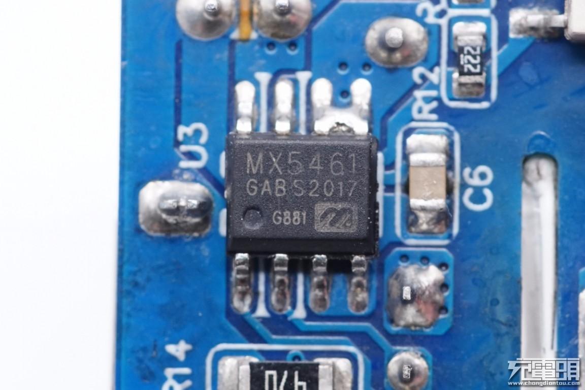 次级芯片MX5461同样来自美思迪赛,已通过高通QC3.0快充认证。芯片内部集成了同步整流控制器、同步整流MOS管,并兼顾协议识别,手机移除快速放电等功能,集成度非常高,一颗芯片就完成了次级侧的所有功能。支持QC3.0/2.0、AFC、FCP、MTK PE2.0+等丰富协议协议,看起来非常厉害。