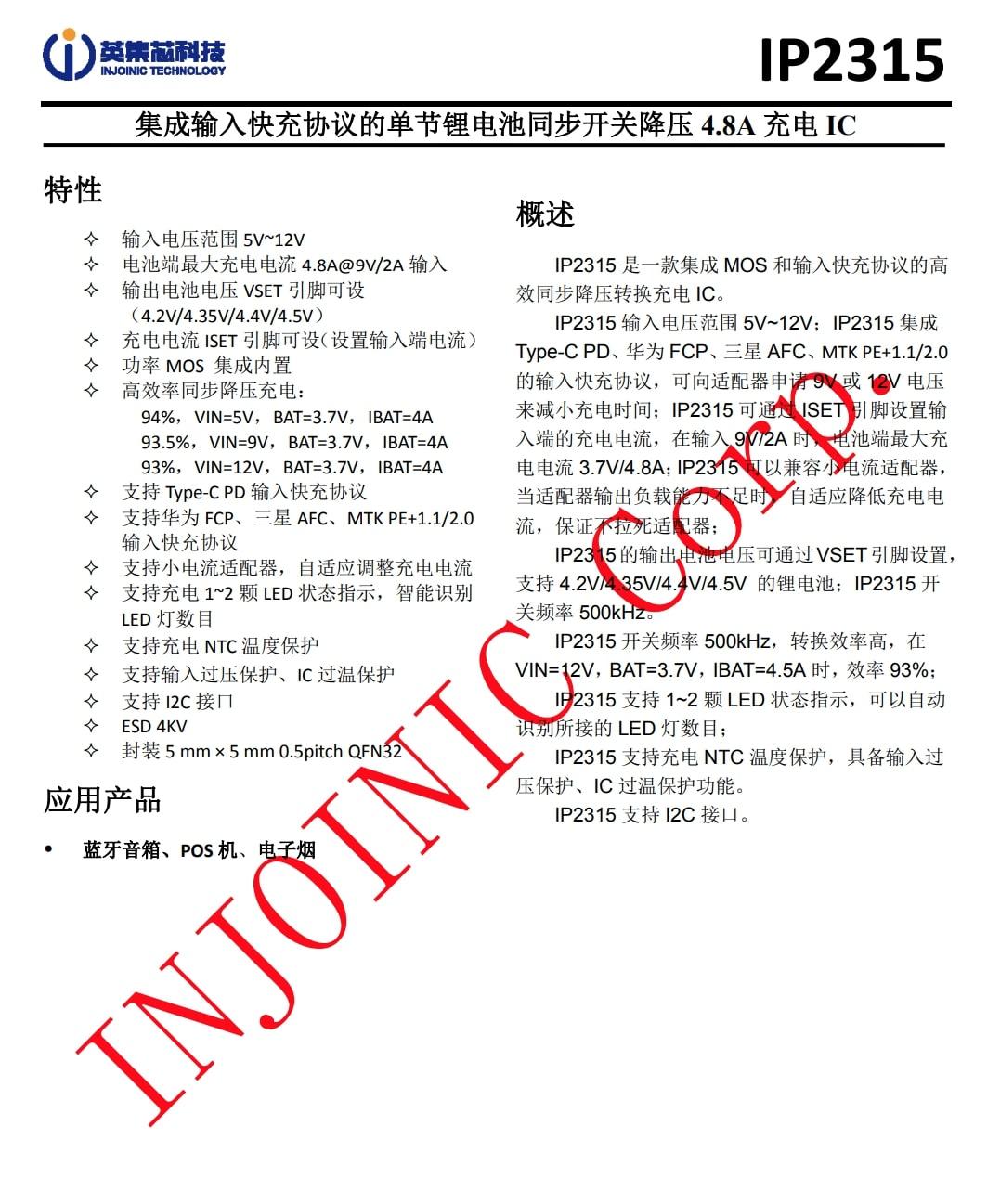 传统5V输入的锂电充电IC,最大只能2A电流输出,对于小容量的电池来说已经足够,但是内置电池容量较大的设备,2A的充电电流,充电时间就比较久了。英集芯IP2315解决了这个痛点,IP2315是支持PD快充的开关降压充电芯片,可以使用PD高压输入,输出4.8A大电流,为大容量电池提供快充。