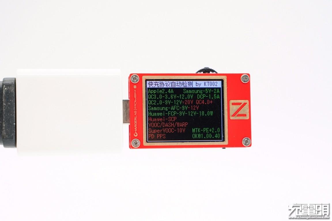 使用ChargerLAB POWER-Z KT002检测USB-A口的输出协议,显示支持Apple 2.4A、Samsung 5V/2A、DCP协议,以及QC2.0/3.0、AFC、FCP、MTK PE2.0+等快充协议。