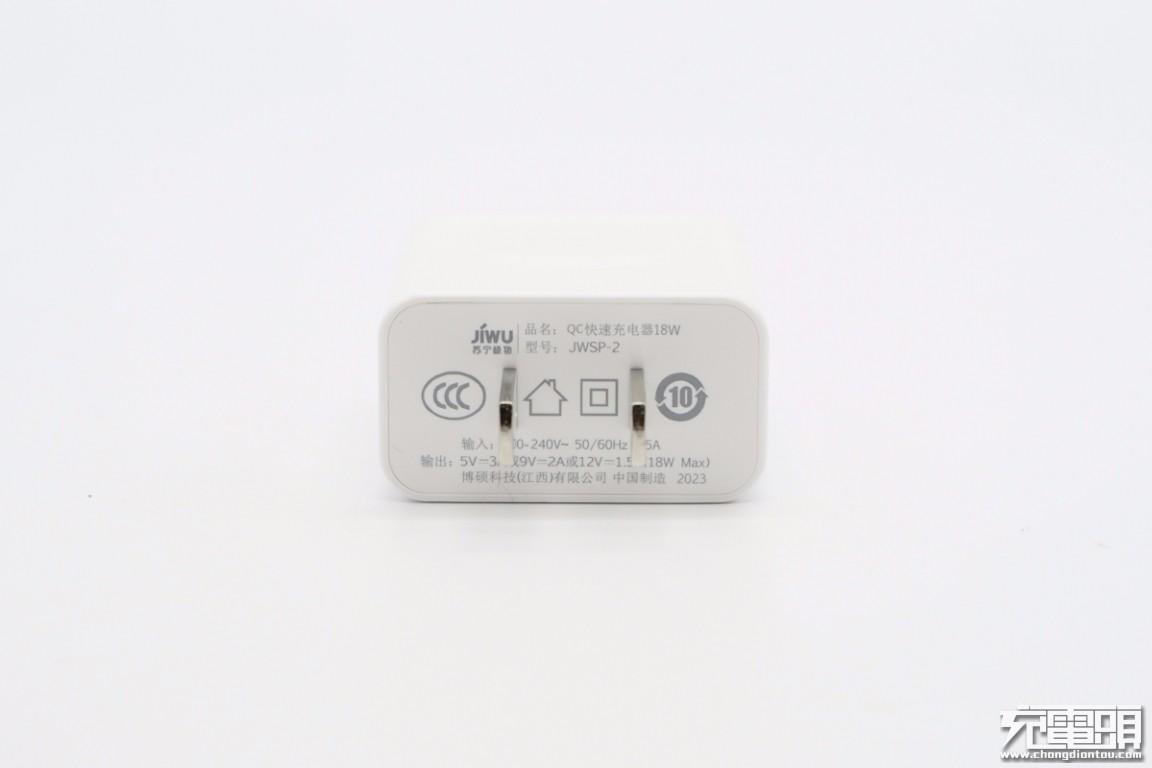 充电器配备固定式国标插脚,外壳上标注有参数信息型号:JWSP-2输入:110-240V~ 50/60Hz 0.5A输出:5V/3A、9V/2A、12V/1.5A制造商:博硕科技(江西)有限公司(立讯科技全资子公司)产品已经通过了3C认证。