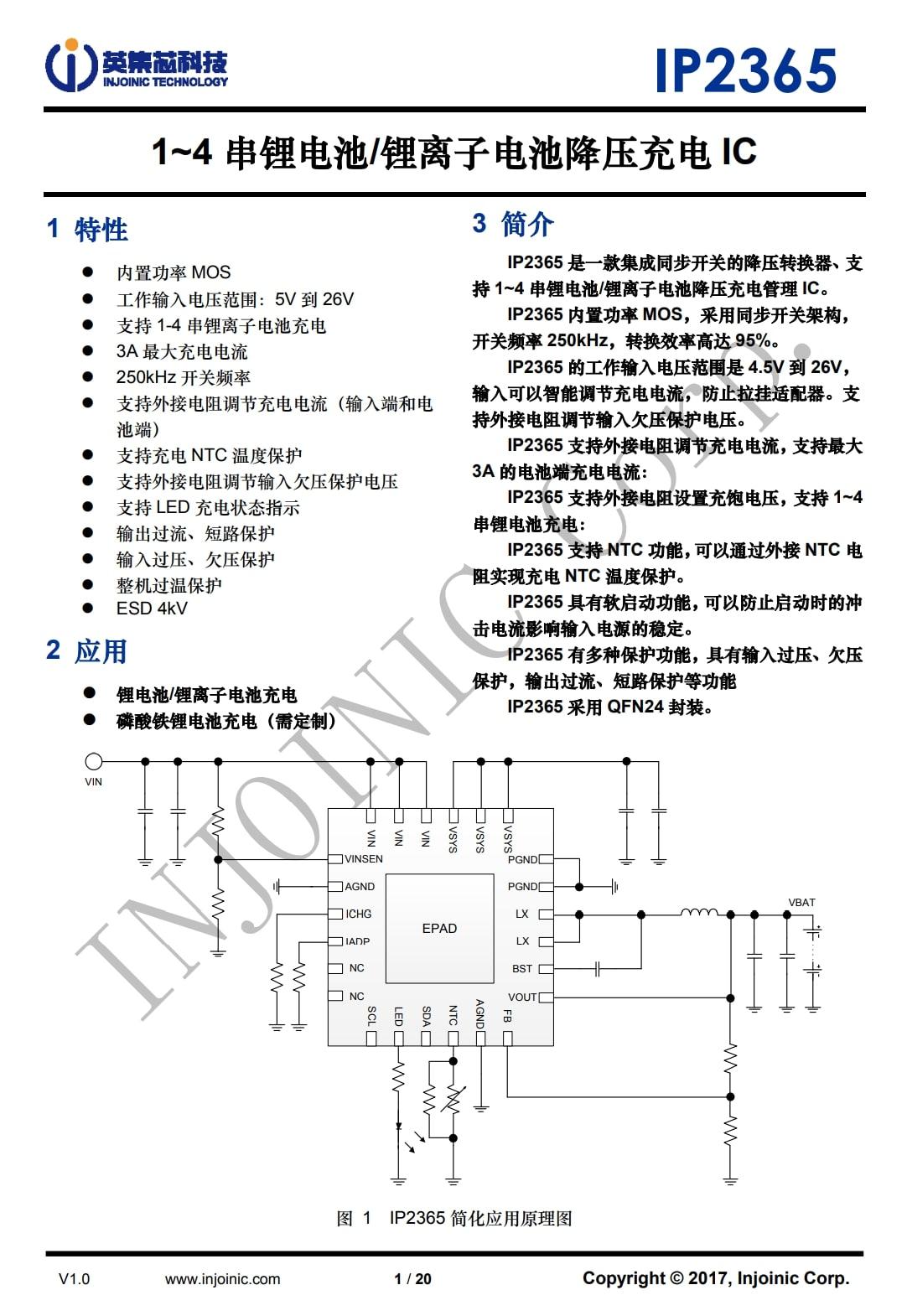 英集芯IP2365内置同步降压MOS管,支持5到26V电压输入,最大输出电流3A,输入电流和充电电流可由电阻设置,支持NTC电池温度检测,支持输入过压、欠压保护,支持单灯充电状态指示,电池节数由电阻设定,输出支持过流保护和短路保护,内置软启动功能及输入电流自适应调节功能。