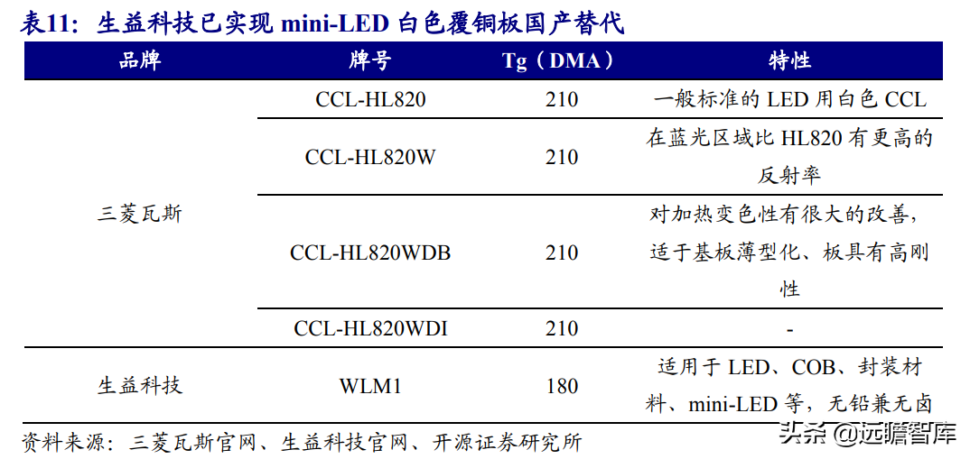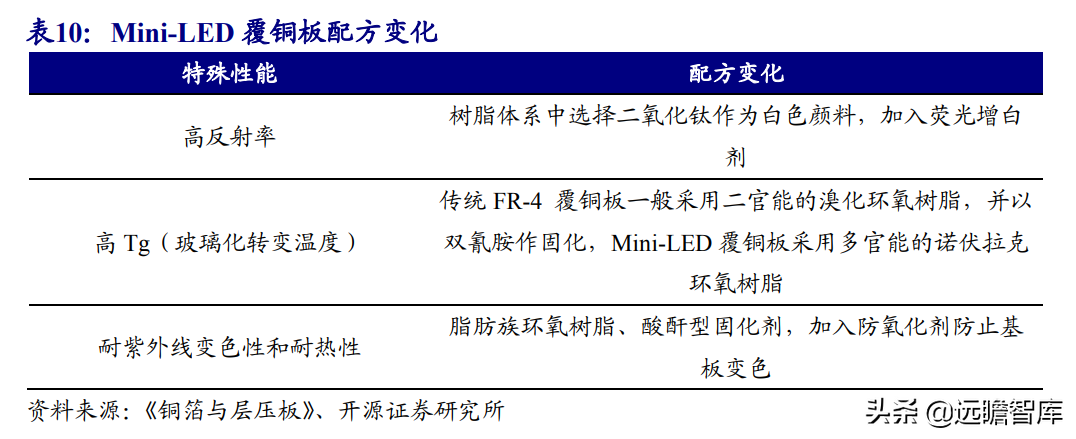 Mini-LED 覆铜板的工艺难度在于高反射率及耐高热辐射,对覆铜板的材料体系都有不同的要求。