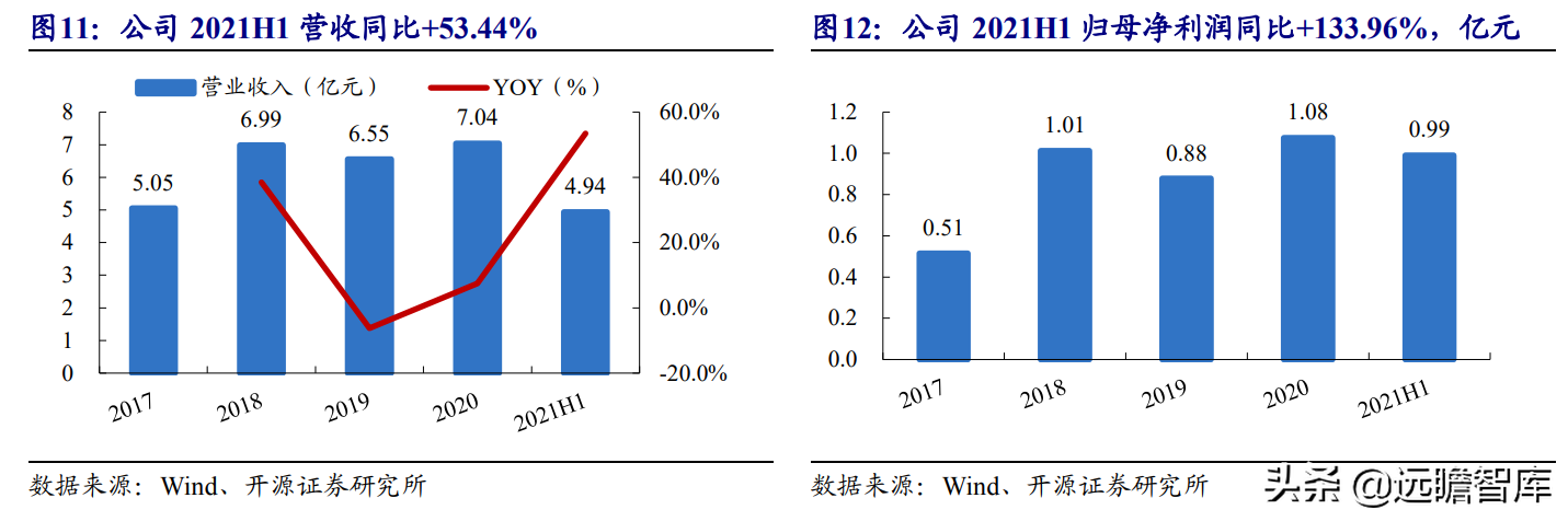公司 2021H1 营业收入大幅增长。公司营业收入从 2017 年的 5.1 亿元增长至 2020 年的 7.0 亿元,近 4 年 CAGR 11.7%,2021H1 营收达到 4.94 亿元,同比+53.44%。