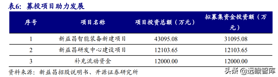 据公司招股书数据,新益昌智能装备新建项目建设期 2 年,投入建设后第 4 年完全达产可实现年收入12.07亿元,公司增长可期。