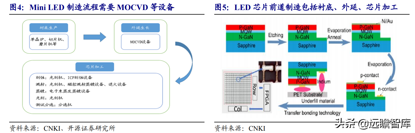 Mini LED 工艺包括前道制造与后道封装,制备流程与 LED 制备流程大抵相似,大部分设备与 LED 制造设备一致,升级改造即可使用,但部分工艺对设备提出了更高的要求,有望给设备厂商带来新的机遇,如前道工艺中的 MOCVD 和测试分选设备,以及后道封装中的固晶机和返修设备。