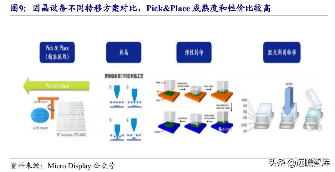 固晶设备转移方案目前包括拾取放置方案(Pick&Place)、刺晶方案和激光转移方案,其中Pick&Place为目前主流应用技术,成熟度和性价比较高。