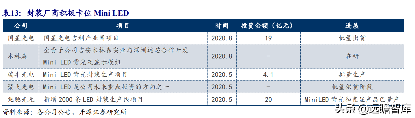 国内国星光电、木林森、瑞丰光电、聚飞光电、兆驰股份、鸿利智汇等厂商积极扩产 Mini LED 产能,卡位 Mini LED 市场。
