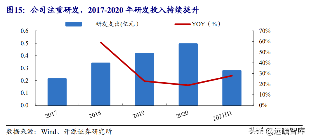 公司研发投入持续提升,2020年研发经费投入达0.49亿元,占营收7.0%,2021H1公司研发费用为0.28亿元,同比+27.84%。