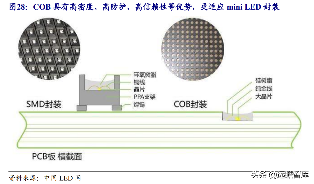 相比 POB,COB 具有高密度、高防护、高信赖性、高适应性、高画质与使用成本低的技术优势,相较于 SMD 小间距产品失效率大大降低,延长了产品使用寿命、降低了使用成本,更适应 mini LED 封装。
