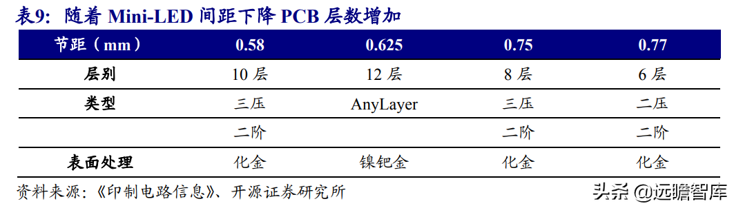 下游厂商采用 P0.7 以下间距的 Mini-LED,随着间距下降,PCB 层数呈现增加的趋势。Mini-LED 采用 COB 封装,对电路板的平整性要求极高,填平规格<1μm。