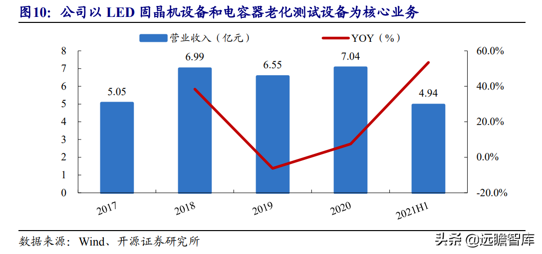公司LED固晶机设备、电容器老化测试设备和半导体封装设备2021H1合计占比约94.4%,其中半导体封装设备营收占比持续增加,2021H1提升至10.7%。
