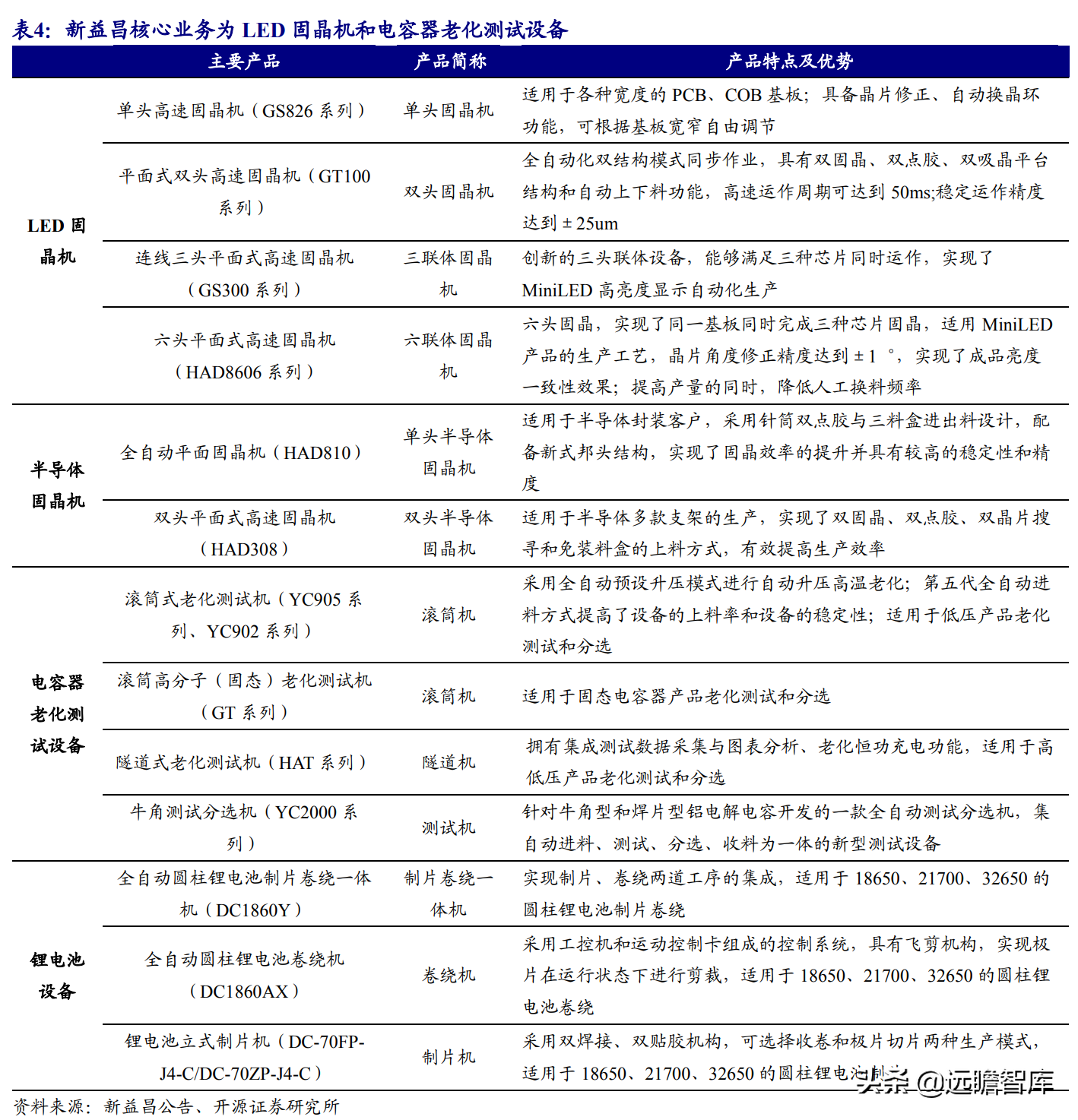 新益昌是国内固晶机设备龙头,业绩增长迅速。新益昌于 2006 年成立,2021 年于上交所上市,经过多年技术积累,成长为国内 LED 固晶机、电容器老化测试智能制造装备领域的领先企业,主营 LED 固晶机和电容器老化测试设备,同时开拓半导体封装设备、锂电池设备业务。