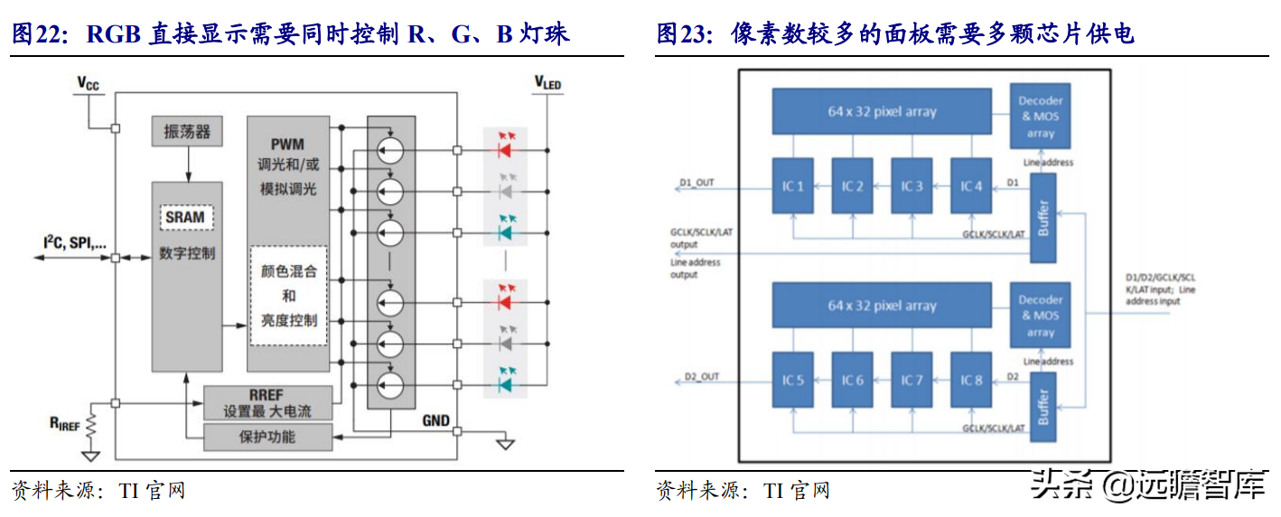 然而,到了 Mini LED 时代,Mini LED 屏幕的 LED 灯珠数量大幅提升,这使得需要更多的 LED 显示驱动芯片给面板供电;如图 23 所示,以 TLC5958 为例,对于 64*64 像素的 RGB LED 面板、有 12228 颗 LED 灯珠,该面板被划分成 了 8 个部分,并由 8 个 RGB 直接显示芯片分别给面板各部分供电。