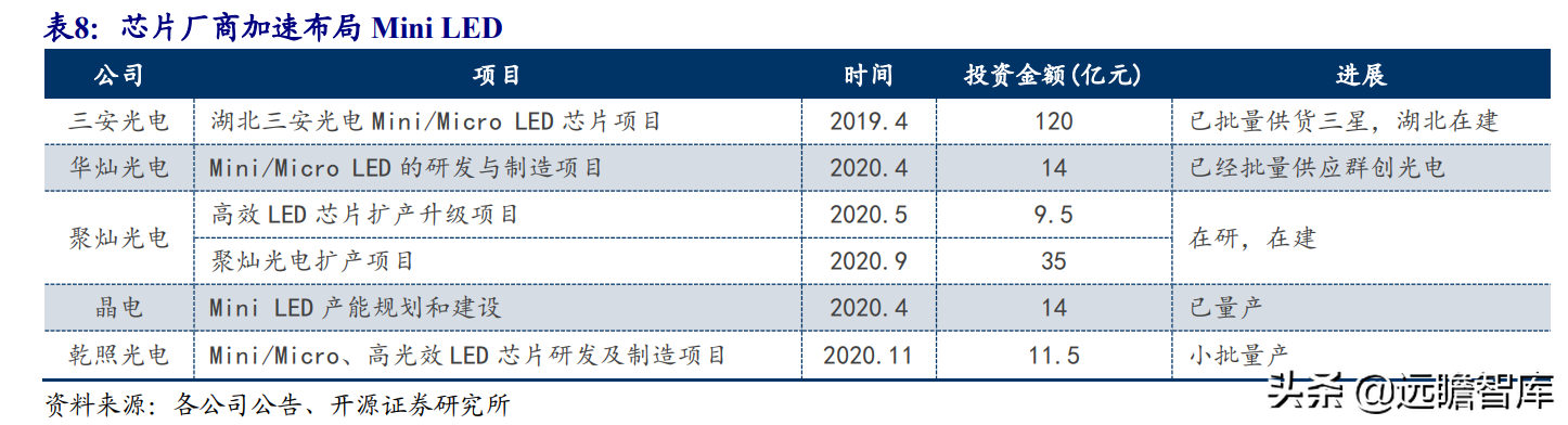 三安光电 Mini LED 芯片已批量供货三星,公司现有产能及泉州三安半导体都有 Mini LED 的产能,湖北三安投资建设的 Mini/Micro 显示产业化项目正处于建设阶段。