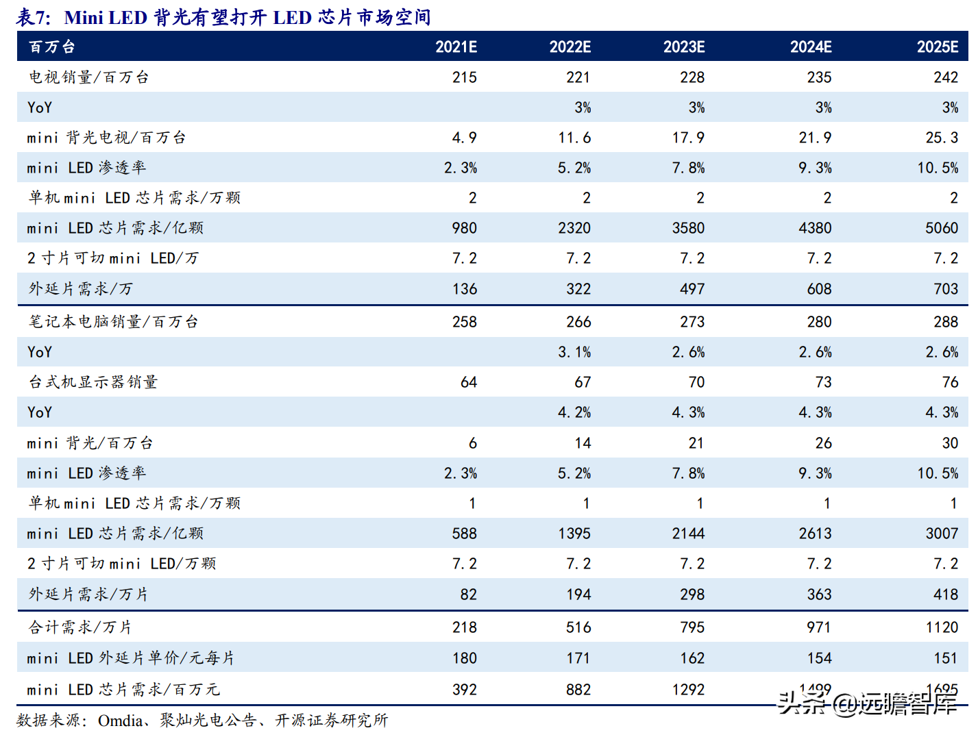 假设 mini LED 背光在笔记本电脑和显示器中的渗透率与 TV 一样,我们测算,到 2025 年,mini LED 2 寸外延片需求约为 1120 万片。