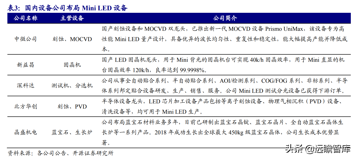 随着苹果、华为、三星/LG等全球大厂陆续推出 Mini LED 的终端消费品,势必将拉动上游厂商对设备材料的大量采购需求,国内部分设备公司已经布局 Mini LED 设备,如中微公司、北方华创、新益昌、深科达等。