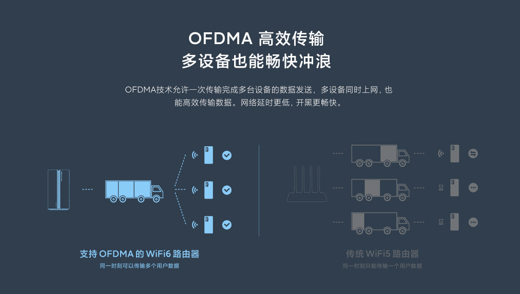 Wi-Fi 6 方案还拥有OFDMA 和 MU-MIMO 两项特性,其中 OFDMA 能在单一信道接入的情况下,将带宽分给多个客户端,使得密集网络环境中的调度方式能更加精细。而 MU-MIMO 则是可以利用空间分集向多个设备提供全带宽帧,高通的Wi-Fi 6解决方案支持双向OFDMA 和MU-MIMO 技术,让网络浏览更加流畅且迅速。