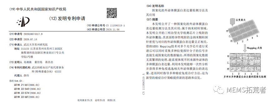 专利三:实现对外泌体的多种膜蛋白表达量的高通量/图案化的检测(基底-外泌体-SERS探针三明治夹心结构)。