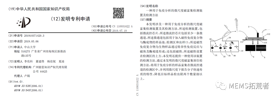 专利一:一种用于免疫分析的微尺度磁富集检测装置及检测方法(利用磁珠的免疫复合物(抗原抗体的方式)实现对微尺度的检测)