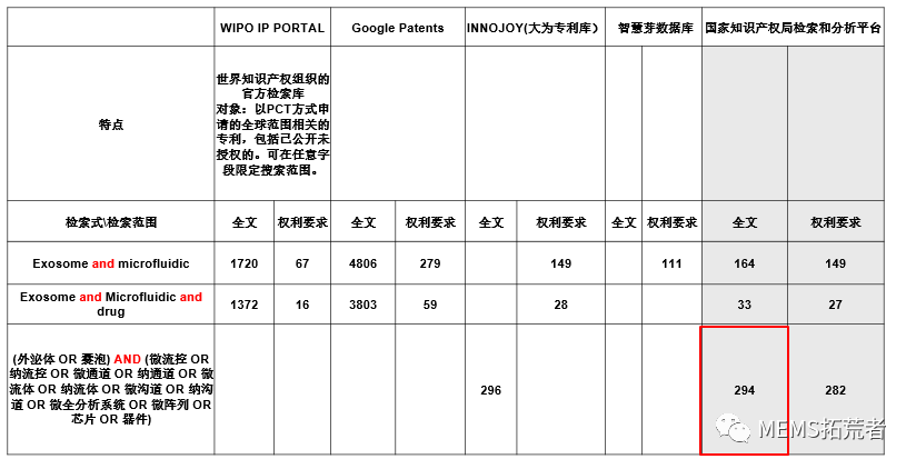 最近几年,一种叫做Exosome的小囊泡正受到大家广泛的关注。Exosome是直径约为30-150nm,密度在1.13-1.21g/m1的小囊泡。Exosome天然存在于体液中,包括血液、唾液、尿液和母乳,外泌体(Exosome)是活细胞分泌的来源于晚期核内体(也称为多囊泡体 )的膜性囊泡。 国内外基于外泌体分离以及检测的微纳器件的专利也越来越多,以下表格是各个不同的数据库搜索到的关于外泌体分离以及检测的微纳器件的相关专利数量对比图。
