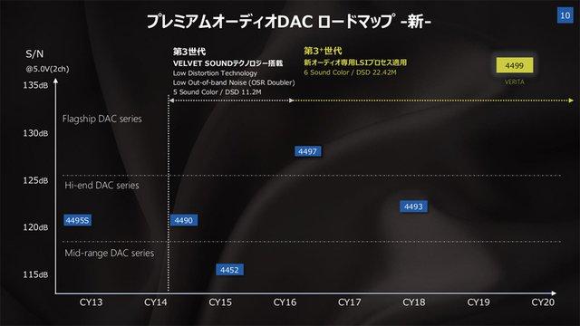 2007年AKM发布的32位高级DAC芯片AK4397,其它参数上和AK4395几乎一致。而真正的代表产品则是2013年诞生的AK4495S,384 kHz/32位PCM和5.6 MHz DSD兼容,它代表了当时的高码率DAC芯片。 大约在这个时候,AKM的名字开始广为人知,并且市场份额一直在增加。 此外,2014年的第三代芯片AK4490也推动了这一趋势。