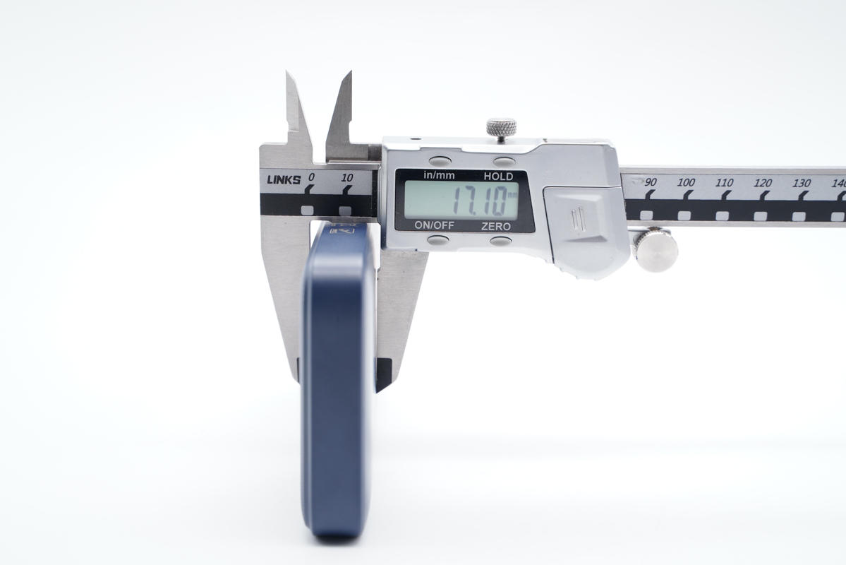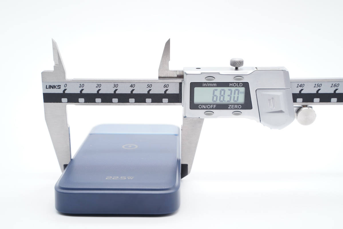 充电宝采用PC材质塑料外壳,机身整体扁平。产品一大细节设计便是头部厚度更薄一些,这样iPhone12/13手机进行磁吸无线充电时摄像头不会被顶到,贴合更好充电更稳定。