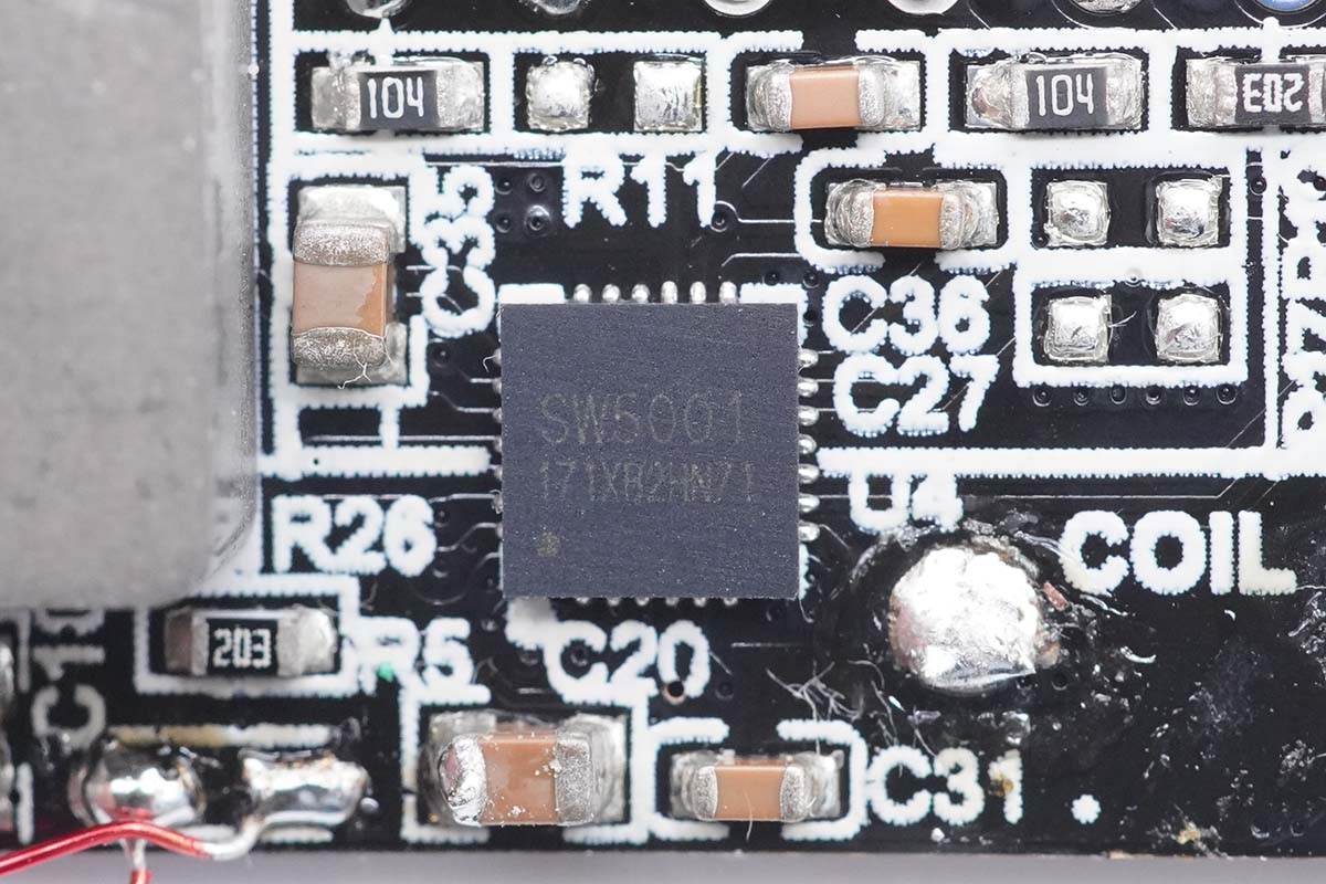 数显屏下有一颗智融SW5001,这是一颗高度集成的无线充发射端集成功率级芯片,内部集成了高效率的全桥变换器和无损电流采样,支持PPS/PD/FCP/SCP/AFC等多种快充协议。集成电压和电流ASK解码电路、Q值检测电路,内部PWM发生器和FSK调制电路,适用于无线充发射端应用,支持最高12V输入,耐压16V,支持15W输出功率。