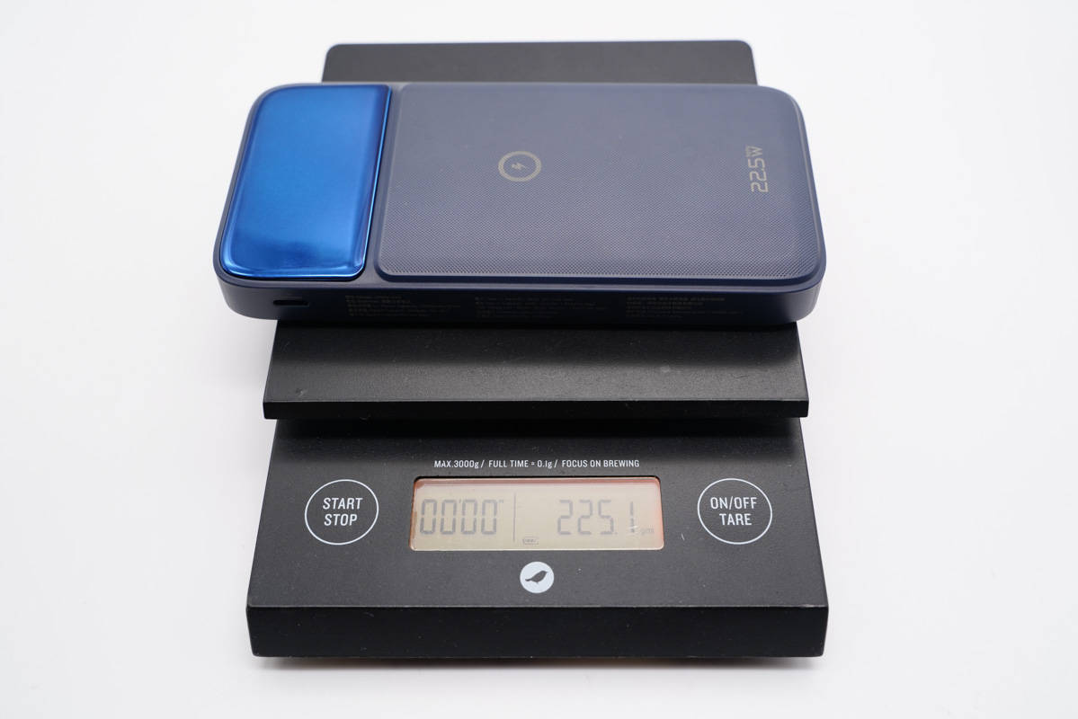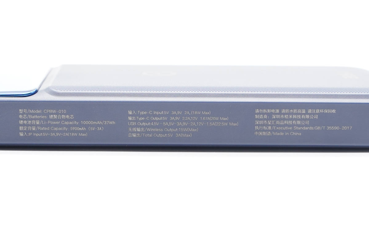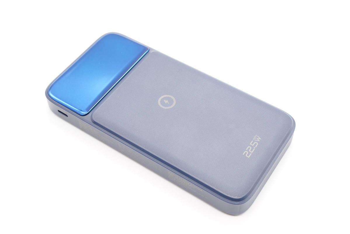 机身正面是亮面板和斜纹理双重设计,中心印有无线充标识,底部印有22.5W字样,表明产品既支持磁吸无线充,也支持PD 20W、华为22.5W等热门有线快充。