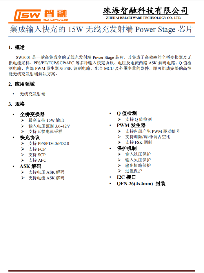 智融SW5001内部集成了5V 50mA供电输出,可为无线充上主控单片机供电,省掉单片机的供电电路。SW5001内部集成输入过压、输入欠压、输出短路及过热保护。同时支持I2C接口,可通过I²C接口向单片机输出状态信息。输入电压可根据分压电阻设定为5V/9V/12V,满足不同功率需求。