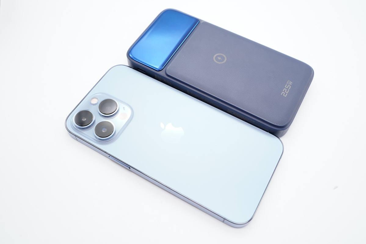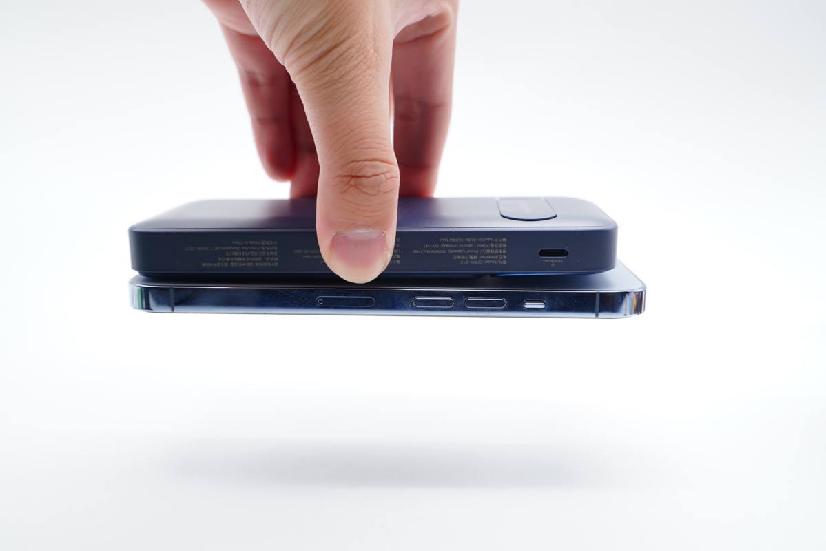 此外移动电源的吸附力也很好,可轻松吸附起iPhone 13 Pro悬空不掉落。