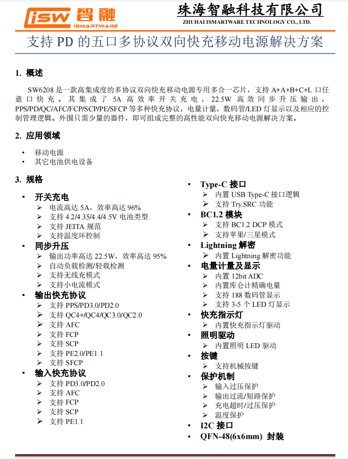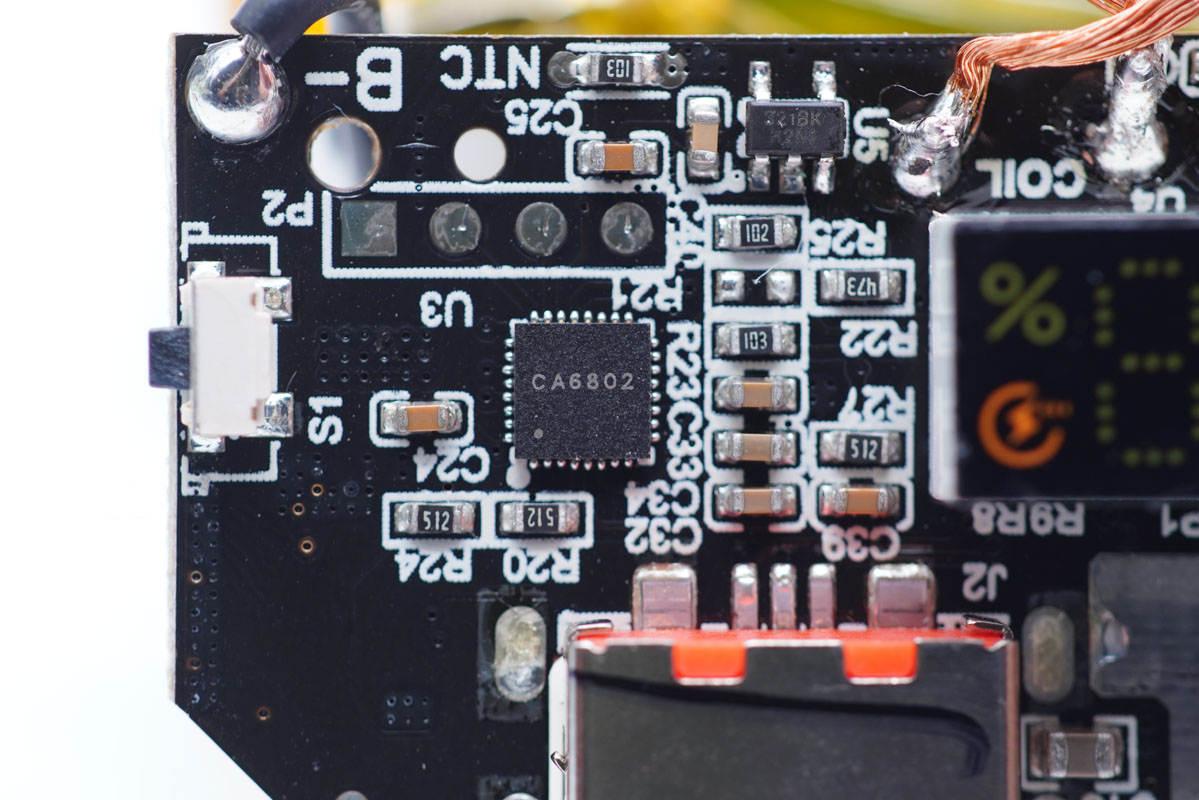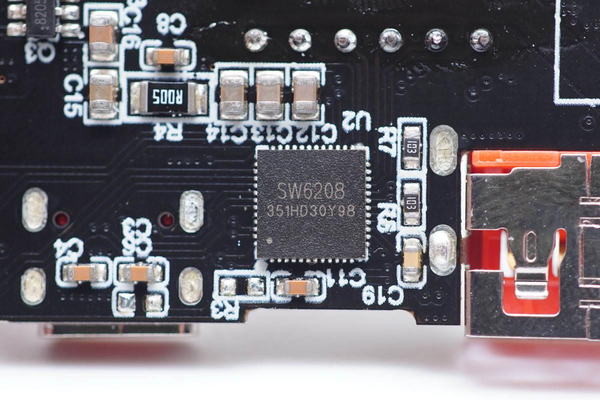 移动电源主控芯片采用智融SW6208。这是一款高集成度的多协议双向快充移动电源专用多合一芯片,支持 A+A+B+C+L口任意口快充。其集成了5A高效率开关充电,22.5W高效同步升压输出,支持PPS、PD、QC、AFC、FCP、SCP、PE、SFCP等多种快充协议,电量计量,数码管/LED灯显示以及相应的控制管理逻辑。外围只需少量的器件,即可组成完整的高性能双向快充移动电源解决方案。