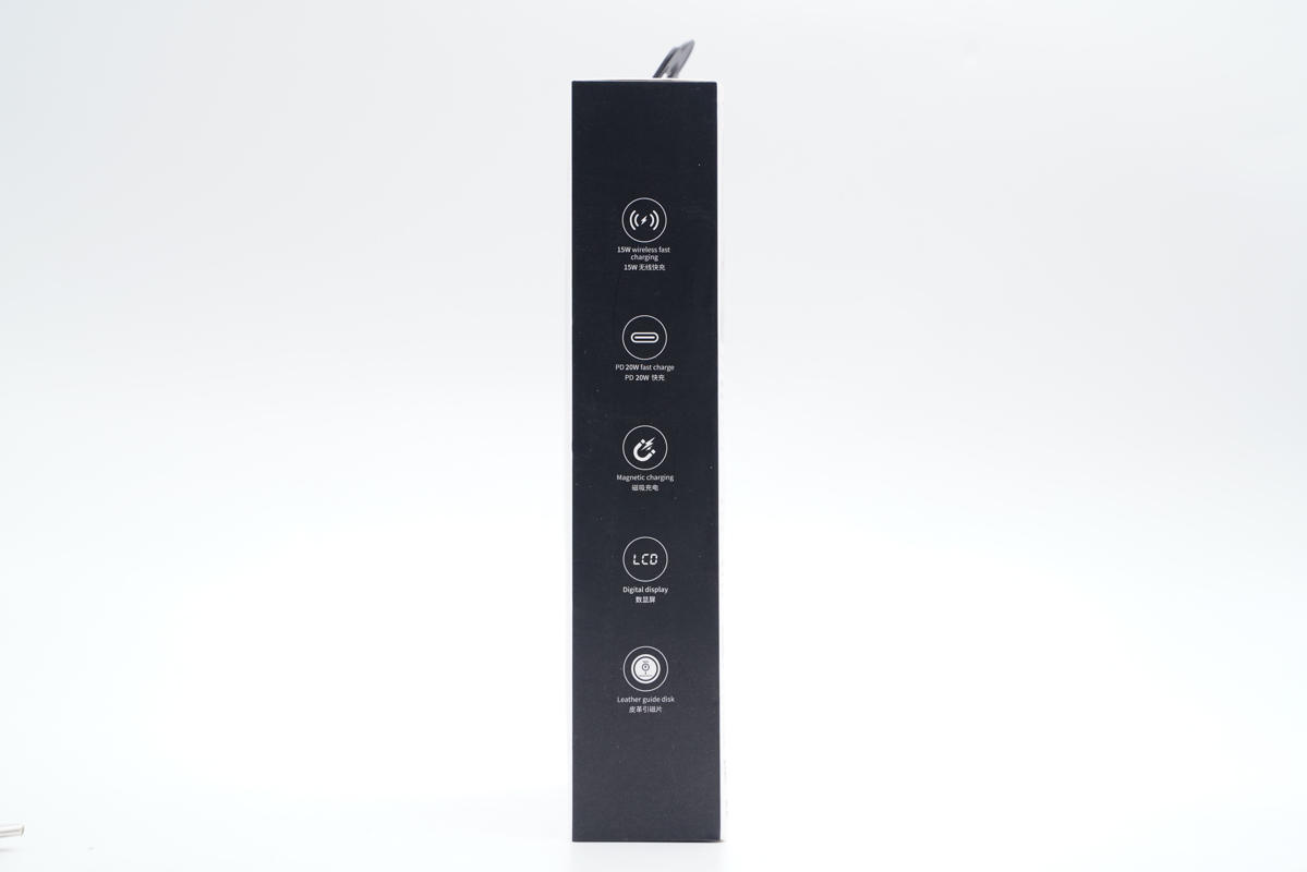 侧面印有产品卖点标识:15W无线快充、PD 20W快充、磁吸充电、数显屏、皮革引磁片。