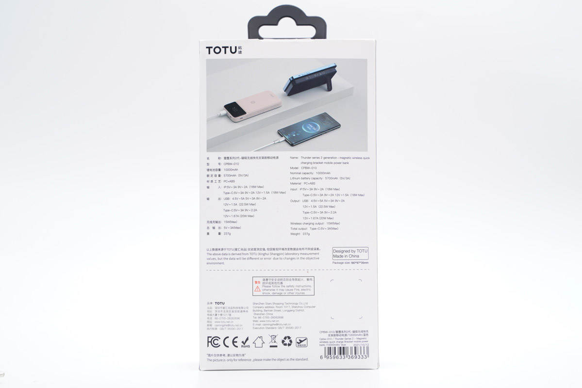 包装盒正面印有TOTU品牌、移动电源外观图和名称等,右下角印有白、蓝、粉三种配色产品外观图,本次拆解的是蓝色款。